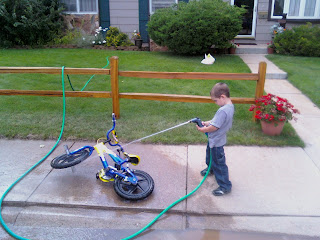 Ohh how sad it is when the weekend has come…….and gone. I spent a better portion of this past weekend with Tyler. Oh big surprise there, huh? He greeted me with his cute little arms wrapping around me. Ohhhhh …does it get any better than this? Oh wait, it really does! Not only did I get random hugs, but he referred to me as “cute Kristi” the entire weekend. We went on a walk/bike ride, we washed my car, and we played this game of light side/dark side that he made up. We played a couple games and with my honest effort to win, he beat me! He rode his bike down the alley looking for his basketball and found every mud puddle, so we washed his bike. ( I know…the picture looks kinda funny…so of course I had to share!!) We went for a ride in my dad’s new truck and Tyler decided he'd make funny faces, unfortunately the “scared” look was the only one that didn’t turn out blurry. (dang camera phones) I read more of the Twilight series, I’m on the third book. We did have quite the rain storm Thursday night and it pretty much rained straight through till Saturday morning. I attached a picture from the Centennial Webcam...check out that lightning!! All in all….it was a great weekend and I miss it already! See ya soon weekend!